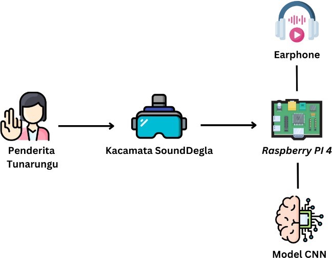 In this section, we will explain several flows that describe the steps in building the system. The designed tool utilizes glasses as a device equipped with a mini camera to capture hand movements (sign language) of deaf people. Input in the form of hand movements will be sent to the Raspberry Pi 4 and processed according to the prepared program, using the Convolutional Neural Network (CNN) model. Furthermore, the processed results will be integrated with the API. Then, the output in the form of voice translation of sign language will be delivered through earphones integrated in Sound-Degla glasses. The system workflow can be seen in the following figure.